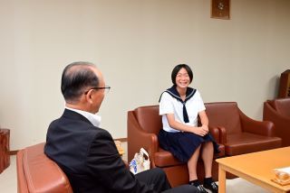 8月6日、全国高等学校総合体育大会(インターハイ)の陸上女子三段跳びで菅野穂乃さん(山形市立商業高校・二中出身)が優勝し、新関茂市長を訪問しました。菅野さんは、「目標の日本高校記録に届かなかったので、U20日本選手権や国民スポーツ大会で記録を更新したい」と今後の目標を話していました。