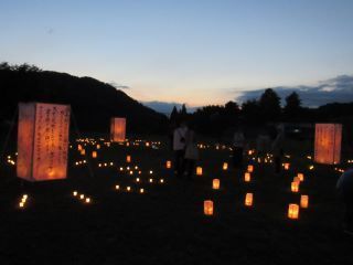 8月31日、市立高原の里交流施設ぽんぽこで、キャンドルナイトinたむぎのが開催されました。この事業は、東北芸術工科大学サークル「みつけたむぎの」が主催したもので、今年で14回目となります。今年のテーマは「物語」。田麦野地域づくり委員会の協力を得て準備を行い、物語や絵が描かれた巨大灯籠と小さな灯籠に火を灯しました。同時に開催されたワークショップでは、物語に入ったとしたら自分はどんな登場人物か想像し、丸うちわやお面で表現しました。参加者は、手作りの提灯を持ち学生と一本杉まで歩いて向かい、ライトアップされた天女の羽衣をイメージした草木染の装飾を鑑賞しました。幻想的でキャンドルの優しい灯を眺めながら、ゆっくりとした時間を過ごし交流を深めていました。