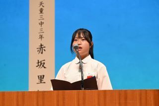 9月2日、第64回天童地区少年の主張大会が、市民文化会館で開かれました。市内の各中学校から選ばれた8人が弁士として参加し、日頃抱いている思いや考えなどを堂々と発表。最優秀賞には髙橋渉未さん(二中3年)の「私もあなたも主人公」、優秀賞には赤坂里帆さん(三中3年)の「『私』でいる勇気」が選ばれました。その後2人は山形ブロック大会に出場し、髙橋さんが優秀賞を受賞しました。