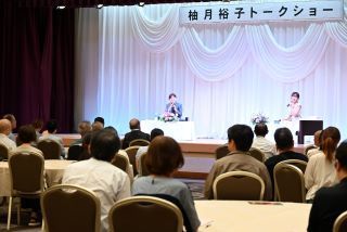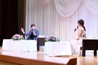 9月16日、県内在住の人気作家・柚月裕子さんのトークショーが滝の湯で行われました。本市が舞台の一つとなっている、将棋を題材にした小説「盤上の向ひまわり日葵」の映画化を記念して天童商工会議所が開催。柚月さんは、本市在住の経験から美しい将棋駒のイメージを持って書けたことやラストシーンは天童駅をモデルにしたことなど、作品の背景や創作秘話を軽快に語り、会場を魅了していました。