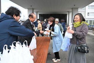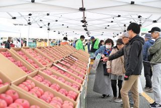 11月8日、天童市農業協同組合本所広場で、第43回天童市農業まつりが開催されました。開会式では、先着300人につや姫と雪若丸のプレゼントが行われました。会場では、天童産の新米やリンゴ、ラ・フランスなどの農産物の販売をはじめ、本市の相互交流協定都市などによる特産物の販売などが行われ、新鮮な秋の味覚を求める多くのお客さんでにぎわいました。