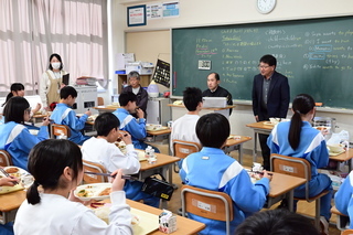 11月28日、二中で、天童産食材の生産者や、学校給食協力会の皆さんを招いて笑顔まんてんどう給食が行われました。これは、生徒が食と農への理解を深め、日頃の感謝を生産者に伝えるために実施しているものです。この日は天童産のつや姫ご飯や、天童産の牛肉や里芋、ネギを使った芋煮など5品が提供されました。生徒たちは農作業のやりがいや苦労などを質問しながら、一緒に給食を食べて交流しました。