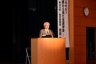 11月18日、市民プラザで、本市と明治大学の連携協定15周年を記念した講演会が開催され、同大学校友会会長の北野大さんが「北野家の訓え」と題し講演を行いました。北野さんは「若い時の苦労は買ってでもするものだ」など、母親から受けた数々の教訓を、弟の北野武さんとのエピソードを交えながら紹介しました。また、おせっかいを生きがいとしていた母親の姿を例に挙げながら、「健康で長生きするには、自分に合った生きがいを見つけることが大切」と語っていました。