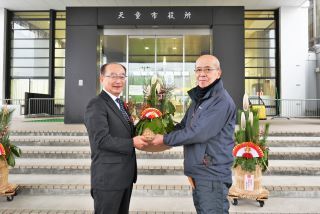 公益社団法人天童市シルバー人材センターから市へ門松が贈呈されました。贈呈された門松は、120センチが2基と70センチが1基の計3基で、市役所正面玄関と総合案内窓口に飾られました。同センターの門松班の皆さんが、こも編みから行い市内の山で採ったユズリハを飾り付け、今シーズンは95基を製作。市役所のほか、市内の公共機関などにも贈られました。