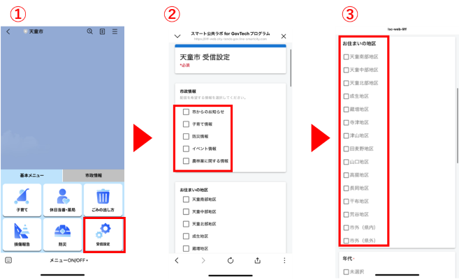 ②市政情報の配信を希望する情報を選択します