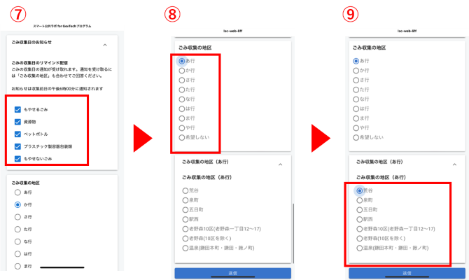 ⑥~⑨ごみ収集日のお知らせを受け取りたい場合は、ごみの種類・ごみ収集の地区を選択します