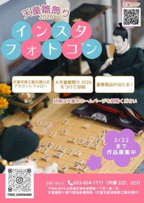 天童雛飾りの期間中、インスタグラムによるフォトコンテスト「天童雛飾りインスタフォトコン」を実施します。天童雛飾り参加施設や雛まつりに関して天童市内で撮影した写真を、インスタグラム上で「#天童雛飾り2026」のハッシュタグを付けて投稿してください。投稿された写真を実行委員で審査し、優秀作品に選ばれた方に天童温泉宿泊券などの豪華景品をプレゼントします。