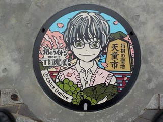 平成30年(2018年)の市制施行60周年に漫画「3月のライオン」を題材に作成されたデザイン画を基にしたマンホール蓋です。